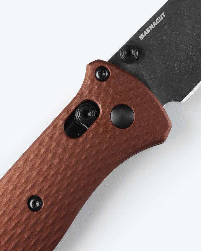 The Bailout® family of tactical folders has long been revered for its combination of no-holds-barred strength and slim, ultralight build, making it an impressive tool on the trail or on the job. The new 537BK-07 Bailout® introduces CPM-MagnaCut stainless super steel with enhanced corrosion-resistance in a DLC Battlewash finish. Together with lightweight, diamond-textured Burnt Copper anodized aluminum handle scales and black oxide hardware, this ruggedized ultralight is ready for the next adventure.