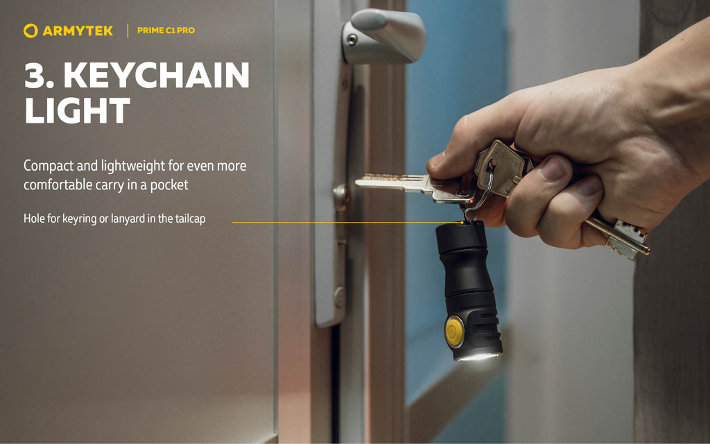 Prime C1 Pro is an incredibly compact yet powerful light source for any daily activities. The flashlight is convenient to carry around: it doesn't take up much space in a bag, easily fits in a pocket or on a set of keys. Classic form factor of the housing, as well as the hole in the tailcap allow using Prime C1 Pro to illuminate the campsite during a trip to nature: all one needs is to hang it on a branch of the nearest tree or on a hook under the ceiling of a tent with the help of a durable lanyard.