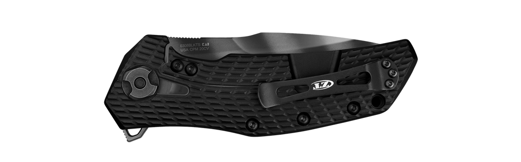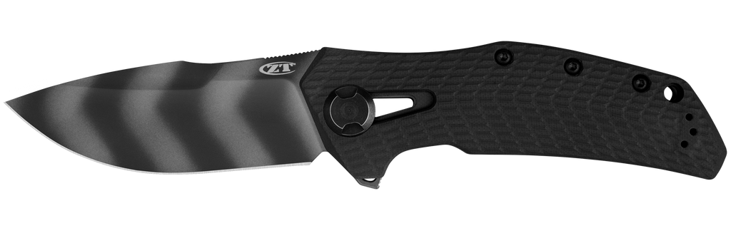 For the first time ever, ZT is using a black-oxide BlackWash finish with its classic tiger stripe pattern. The 0308BLKTS offers a beefy 3.7-inch tiger stripe blade with premium CPM 20CV blade steel. The handle features black G10 on the front scale with a titanium back. Both the front and back are heavily 3D machined for an ultra-secure grip. The .25-inch solid pivot features a custom nut that enables it to be adjusted in the field with a 1/2-inch wrench. The pocketclip hole pattern is compatible with many after-market clips.