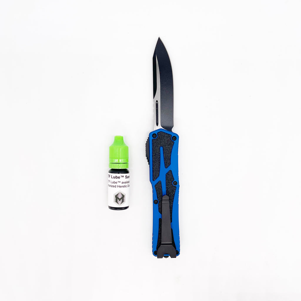 The Colossus bears a host of features that solidifies its place in the Heretic OTF lineup. Designed to deploy with immense strength and power, it employs a patent pending button glide action. Ball bearings have been introduced into the new button glide action, reducing friction, for a quick, but smooth blade lockup. Grip-enhanced inlays on both sides of the handle offer both style and functionality, though an inlay delete option is available for those who prefer a smoother finish. An ambidextrous pocket clip makes this an ideal carry for right or left-handed use.