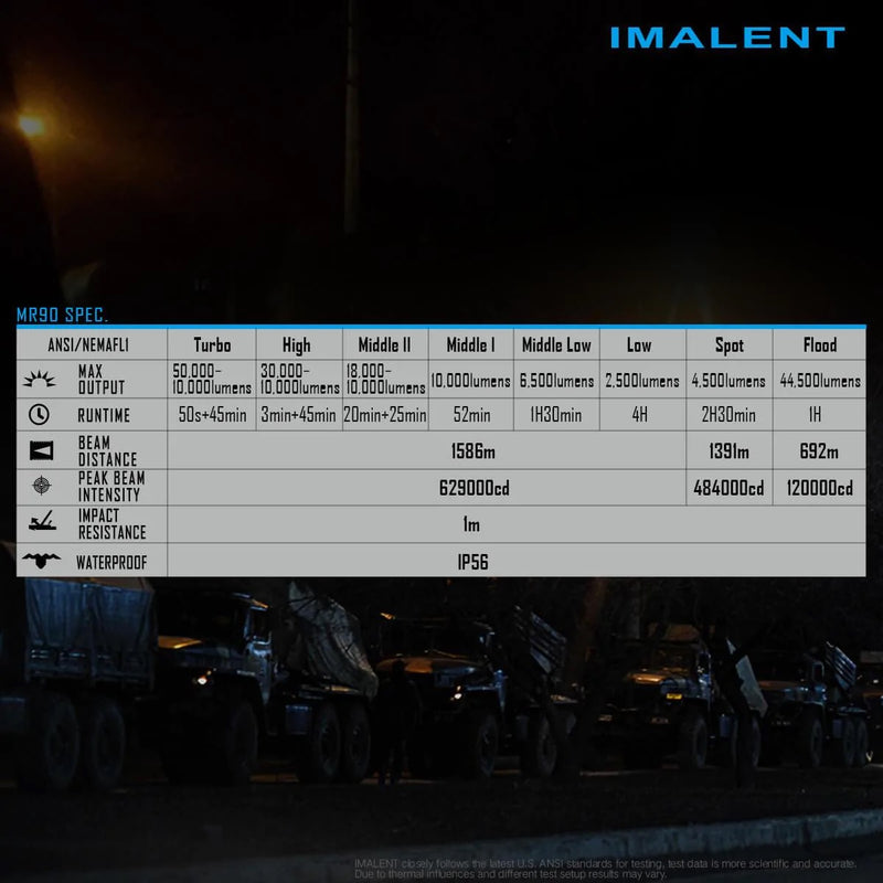 The IMALENT MR90 flashlight is a high-performance rechargeable searching flashlight that combines spot- and floodlight. The utilizes 8 pieces of American CREE XHP70 2nd LEDs and 1 piece of American LUMINUS SBT 90 2 nd LED, with a maximum output of 50, 000 lumens and longest range of up to 1586 meters.