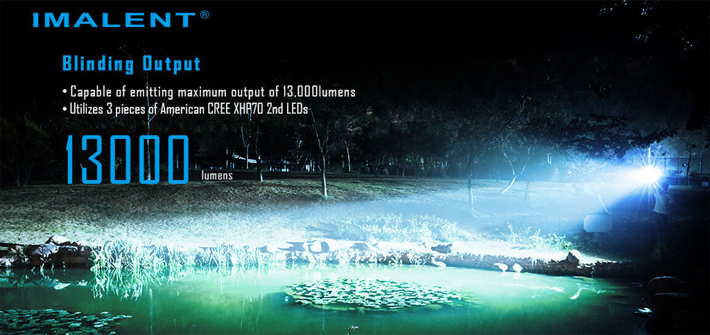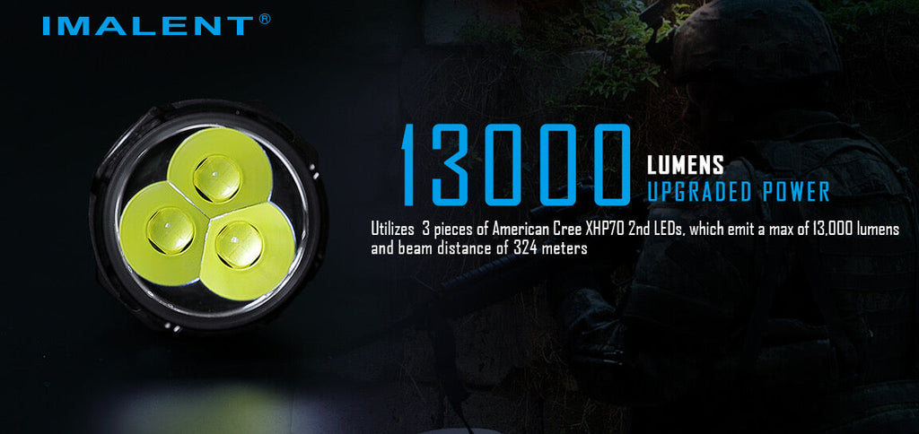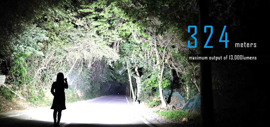 Powered by one high drain 21700 Li-ion battery with built-in type-C USB charging, it emits a max of 13,000 lumens and beam distance of 324 meters .