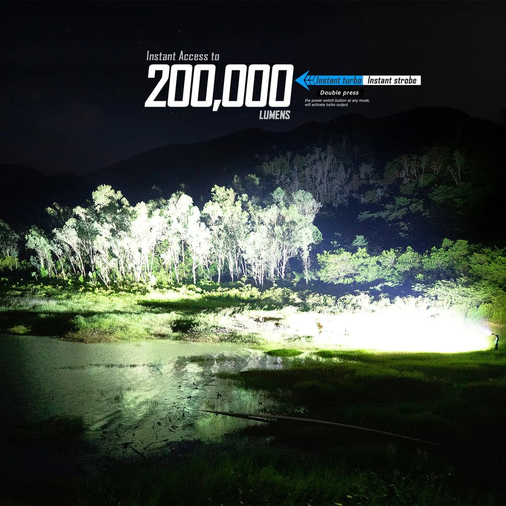 Turn night into day with the Imalent MS32, the brightest handheld flashlight in the world. Powered by 32 CREE XHP70 2nd LEDs, it delivers an unprecedented 200,000 lumens with a beam distance of 1,618 meters — equal to the output of more than 100 car headlights.