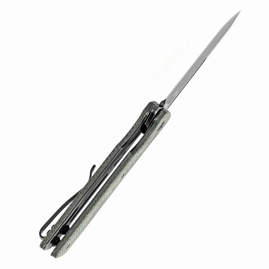 The green micarta handle provides a secure grip with a visually appealing appearance. Its ergonomic design ensures comfort during extended use. The knife features a smooth manual deployment and a solid liner lock mechanism that ensures reliable, confident lockup.