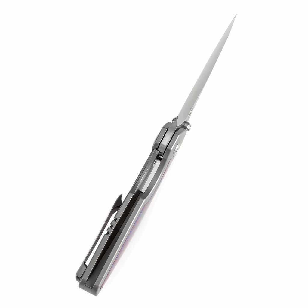 -The handle features a dual-material construction, seamlessly combining titanium with carbon fiber or Timascus inlays. This combination of materials enhances both the aesthetics and the tactile experience of the knife, adding a touch of elegance and sophistication to its design.