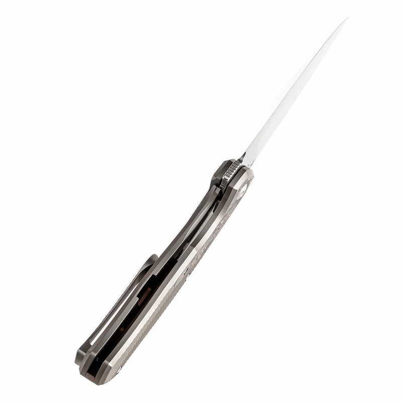 The handle is crafted from 6al4v titanium, carbon fiber, and Timascus, featuring internal milling in the 6al4v Titanium frame for an exceptionally lightweight build.The wave millings on show side and titanium pocket clip add both visual interest and improved grip.