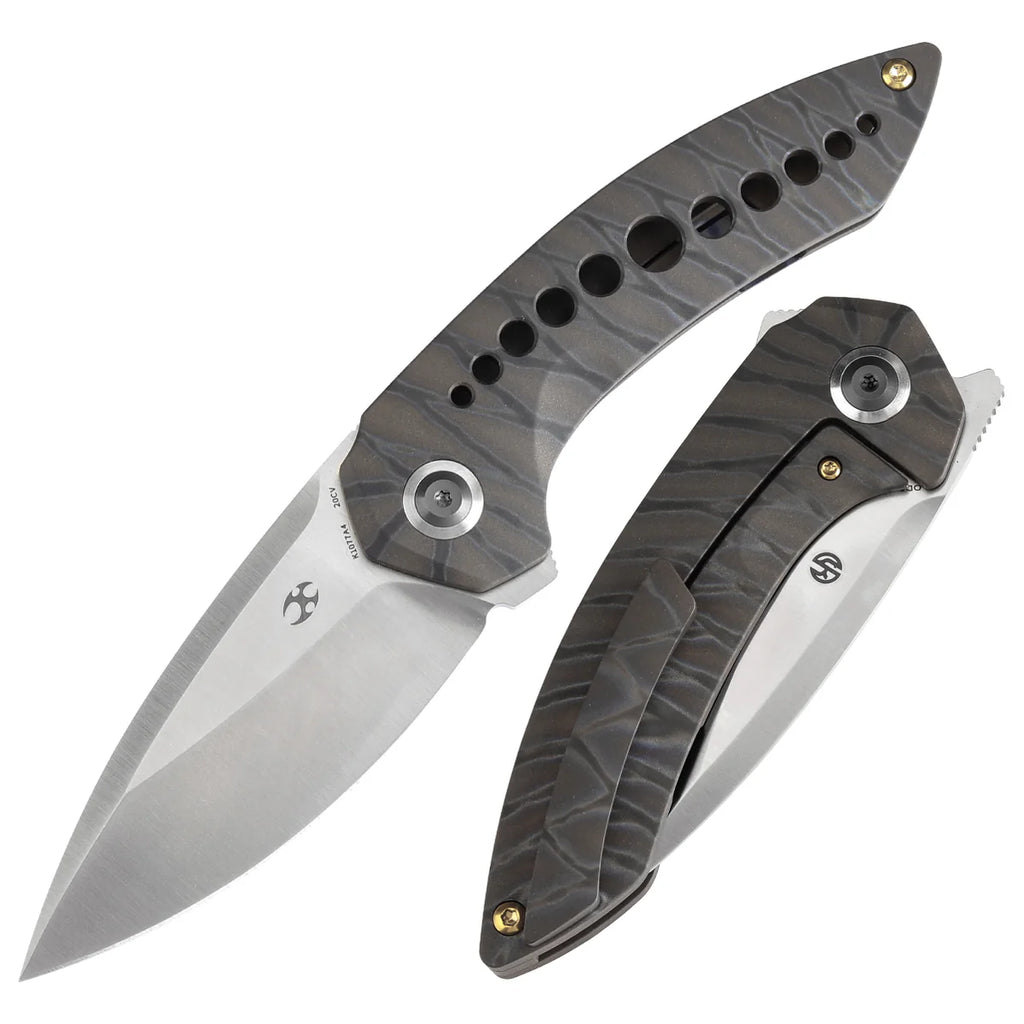 -The Odd 21 folding knife boasts a handle crafted from titanium, featuring gently curved lines that conform perfectly to the palm. With handle access on both sides, the grip is enhanced for greater comfort and security. The hole design not only enhances aesthetics but also improves traction, ensuring a dependable hold during use. This ergonomic design marries style and functionality for a satisfying handling experience.