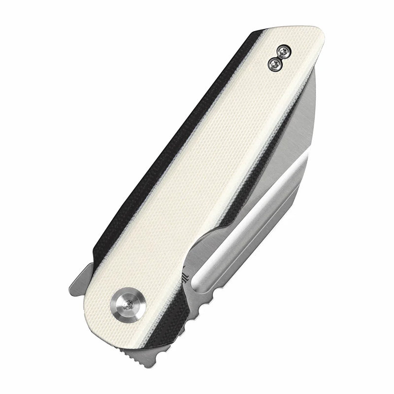 The handle features a sophisticated ivory white and black G10 combination, giving the knife a distinctive appearance while offering exceptional grip and durability. G10 construction resists moisture, impact, and wear, while the ergonomic shaping ensures comfort during extended use.