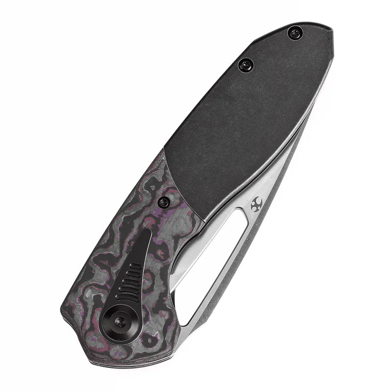 -The handle features a dual-material construction, seamlessly combining titanium with carbon fiber or Timascus inlays. This combination of materials enhances both the aesthetics and the tactile experience of the knife, adding a touch of elegance and sophistication to its design.