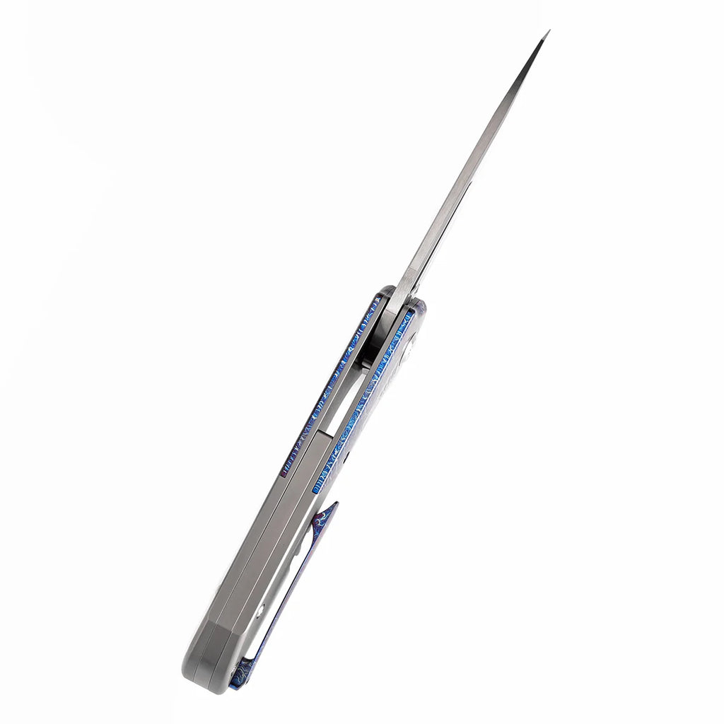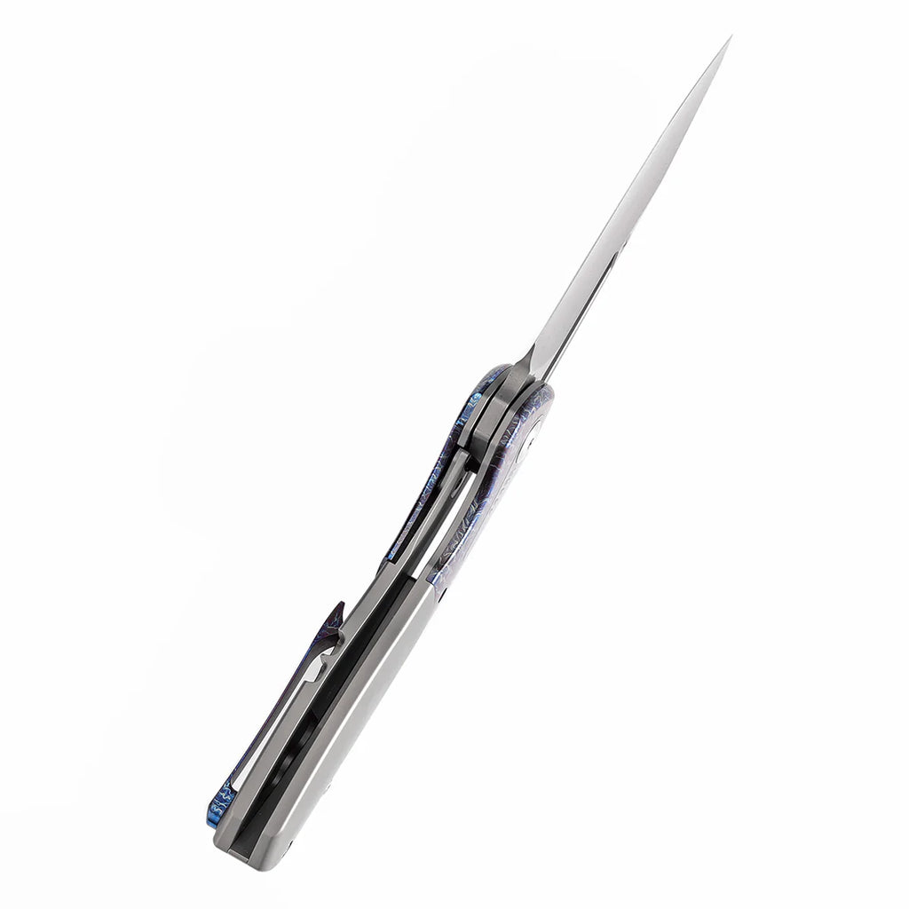 -The handle features a dual-material construction, seamlessly combining titanium with carbon fiber or Timascus inlays. This combination of materials enhances both the aesthetics and the tactile experience of the knife, adding a touch of elegance and sophistication to its design.