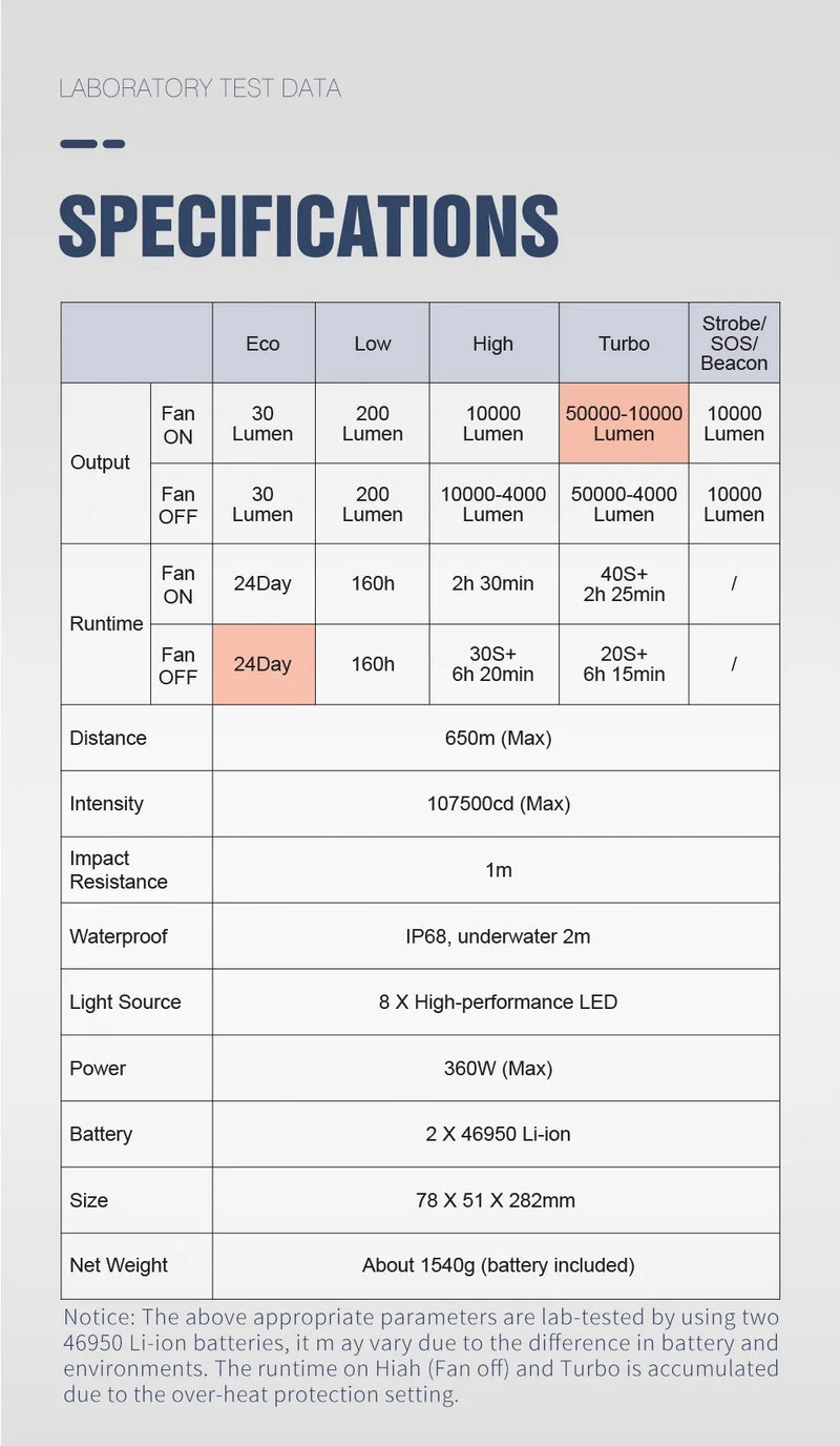 50,000 Lumens & 650m Beam – Extreme power and reach