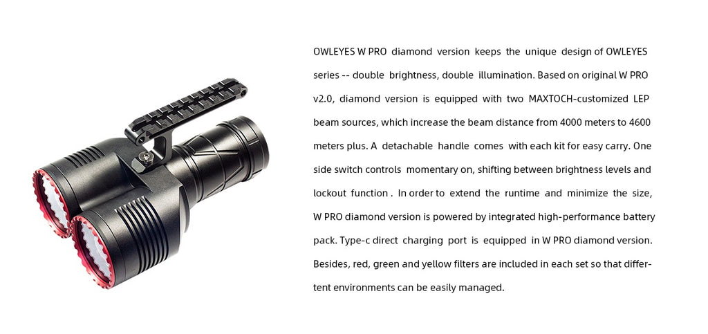 Engineered for extreme throw and professional-grade performance, the OWLEYES W PRO Diamond version upgrades the already legendary W PRO v2.0 with dual MAXTOCH-customized LEP beam sources. This leap in optical precision pushes the beam distance from 4,000 meters to an astounding 4,600 meters — perfect for search, rescue, hunting, and tactical use.