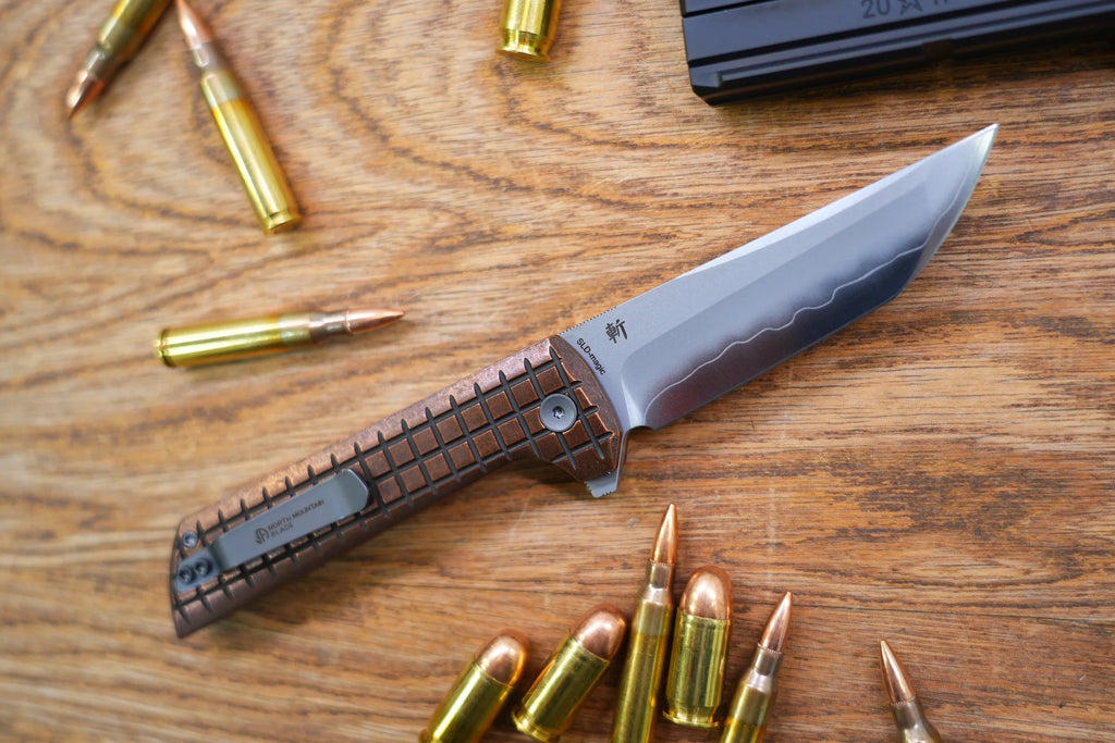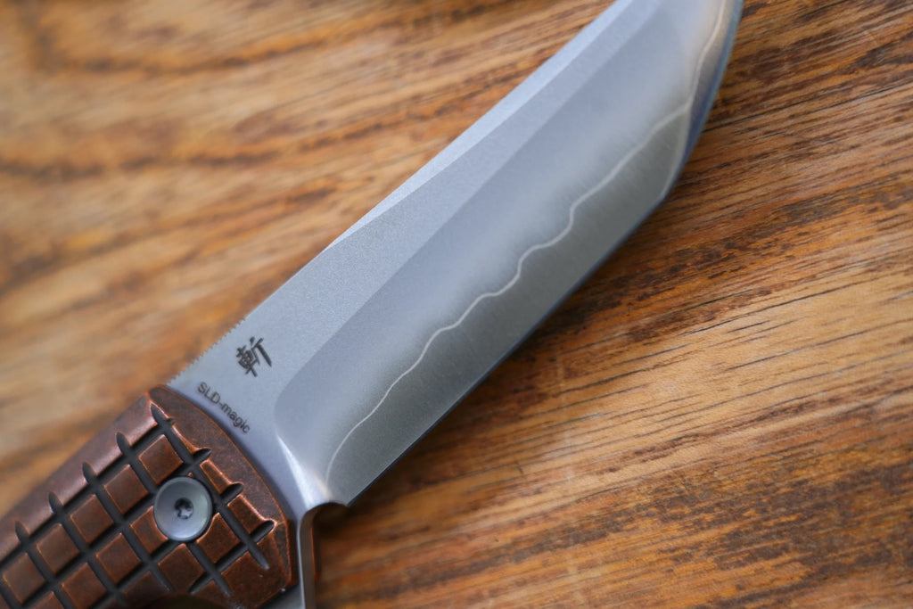 Introducing the our Chop 2 folding knife, specifically engineered for the American market, The smooth bearing opening allows the blade to be opened and closed with one hand, making it more convenient to use while you work, especially when your other hand is doing other things.,offering improved functionality and refined craftsmanship. Equipped with a widened blade for a more robust appearance, this knife features Japanese SLD-Magic SAN MAI steel, known for its 60-61 HRC hardness, offering excellent durability and edge retention. The patented hot forging technique results in a striking three-layer blade finish, reminiscent of a samurai sword, with frosted, matte, and mirror-polished sections.