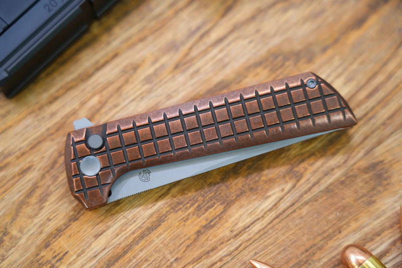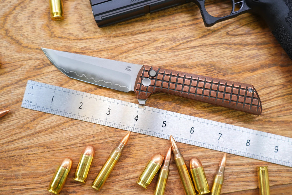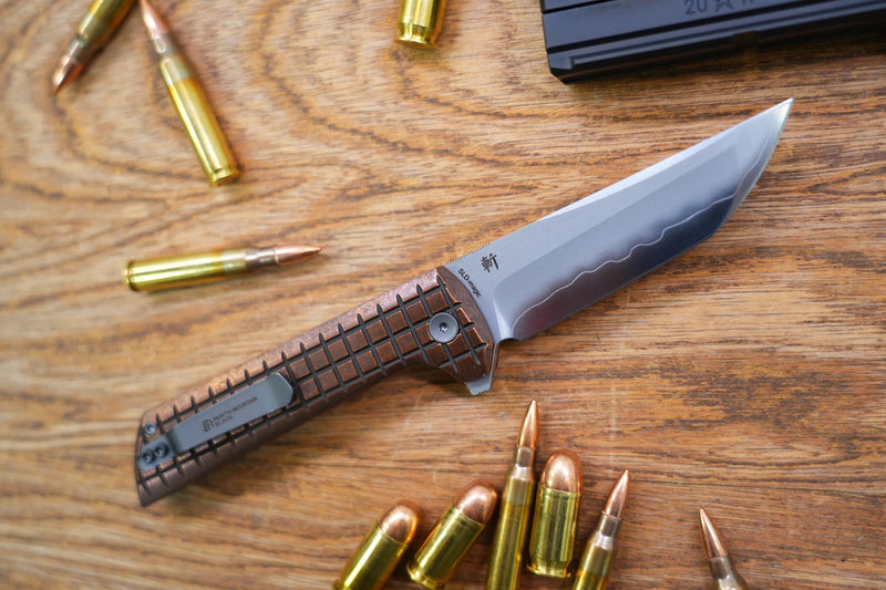 This knife features ceramic bearings and a brass frame, allowing for smooth opening.