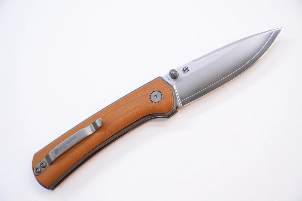 It opens smoothly with ceramic bearings, and the main pivot screw on the handle is hidden. The knife uses a liner lock with a shallow lockup, allowing for long-term use without compromising the locking mechanism. The handle is skeletonized on the inside.