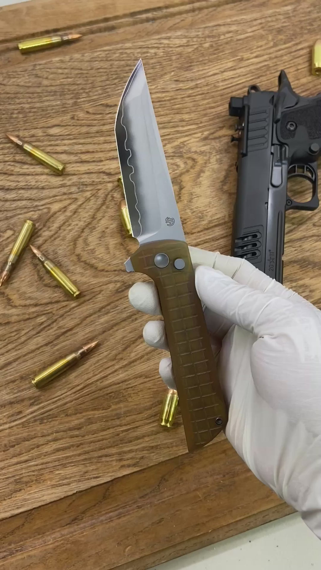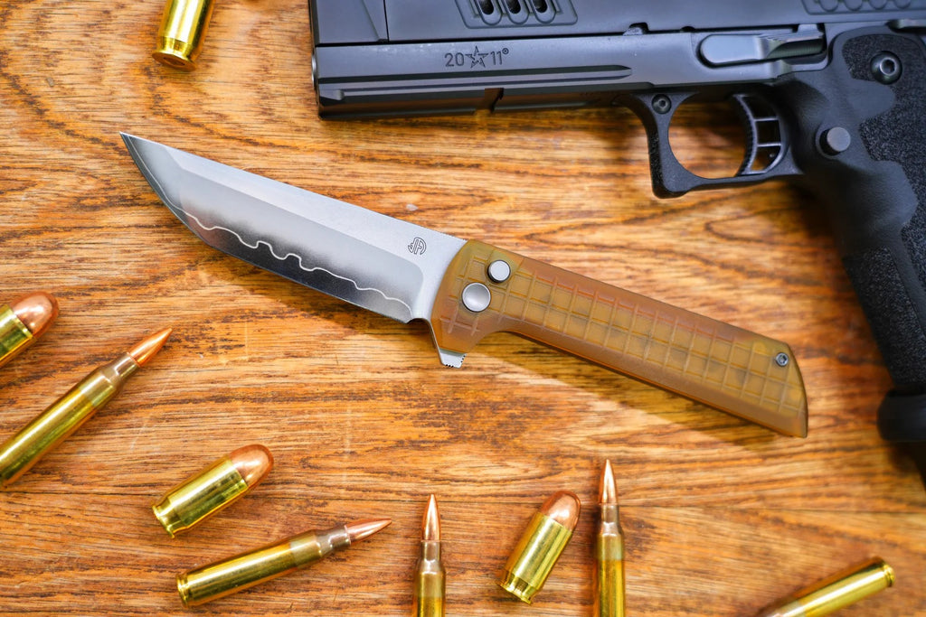 The amber PEI (Ultem) handle offers a unique translucent finish with lightweight strength, while a brass frame adds stability. Smooth action comes from ceramic bearings, paired with an upgraded push-button locking system and traditional clamshell opening for secure, fluid deployment.