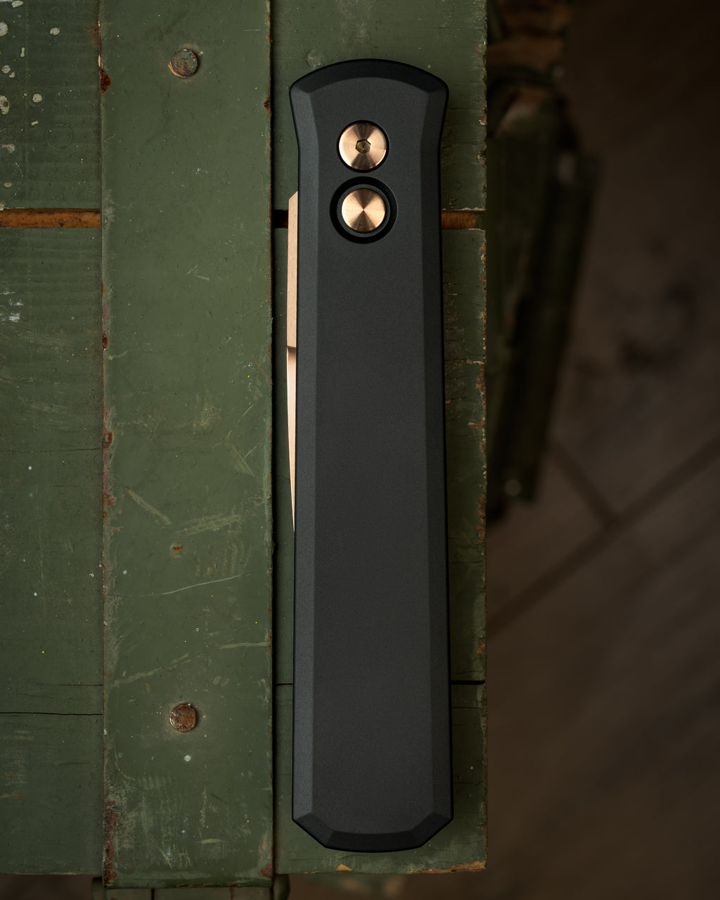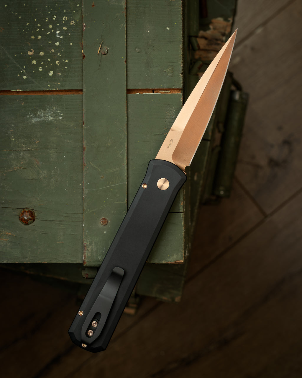 The Godfather sports a 4in automatic spear point 154cm blade with black smooth aluminum handles but what makes this classy knife classier is the rose gold coated blade and hardware!