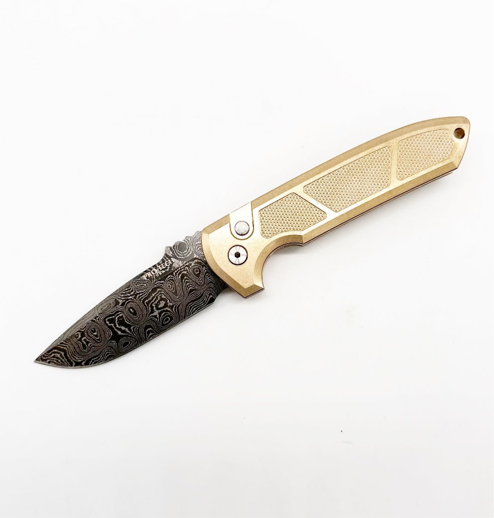 Pro-Tech Rockeye 2024 Custom 001 Chad Nichols Virus Damascus Blade ALBronze Textured Handles Blue Titanium Clip