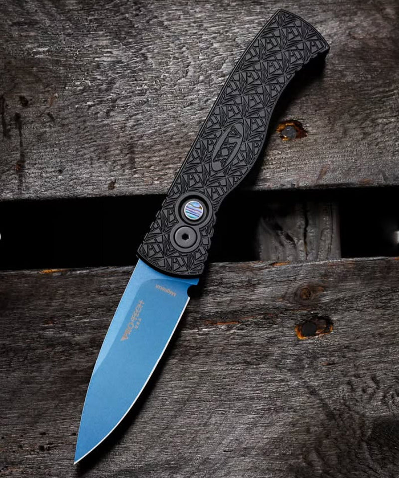 Tactical Response 2 - NEXUS "Since 1999" textured black handle, Sapphire Blue Magnacut Blade, abalone button, black hardware, deep carry pocket clip.