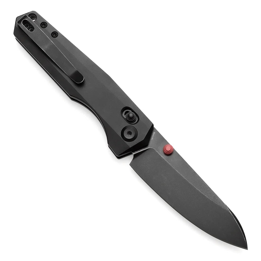 The black anodized aluminum handle provides a secure grip with a sleek, modern appearance. Its ergonomic design ensures comfort during extended use. The knife features a smooth manual deployment and a solid crossbar lock mechanism that ensures reliable, confident lockup.
