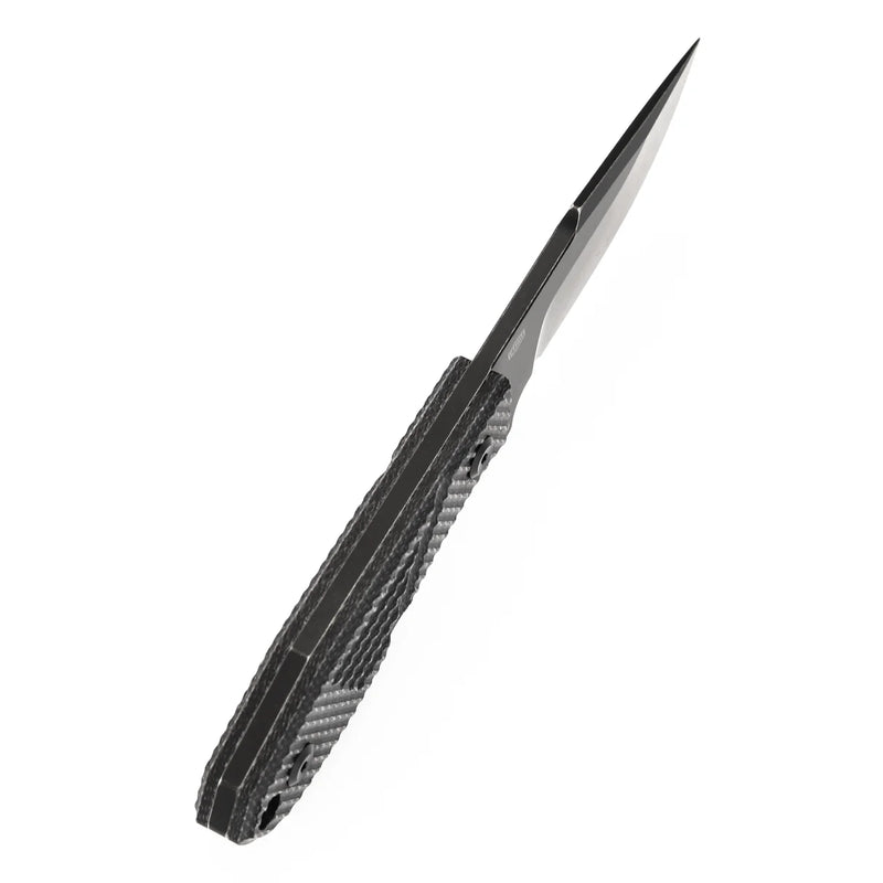 The handle features black micarta, offering a lightweight yet durable construction with a modern aesthetic. The ergonomic design ensures a comfortable grip, providing excellent control and usability.