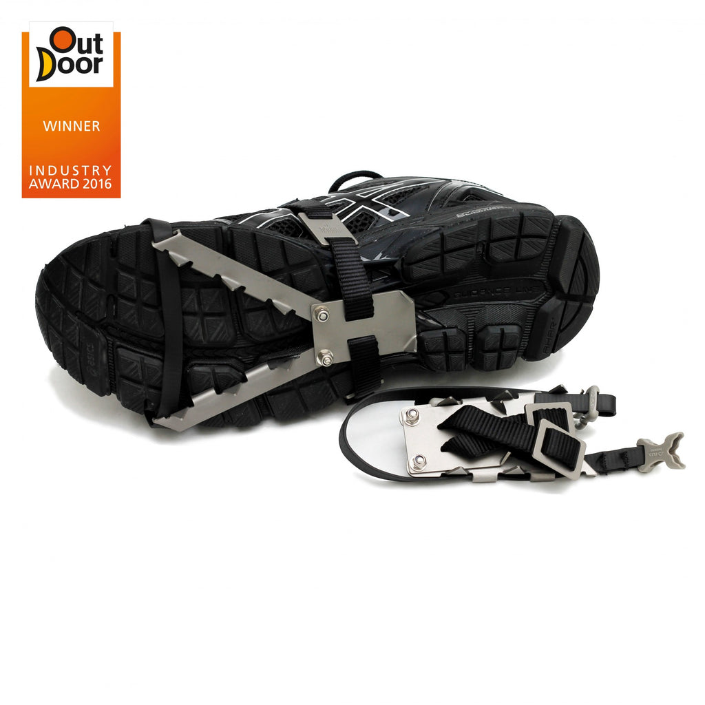 Improve speed and traction on winter runs or ultralight hiking with the Vargo Titanium Pocket Cleats. The titanium alloy spikes claw into snow and ice yet weigh nearly a third the weight of the competition without reducing strength or durability. When not in use the legs fold down and nest to easily fit into packs or pockets. Nylon carrying case included.