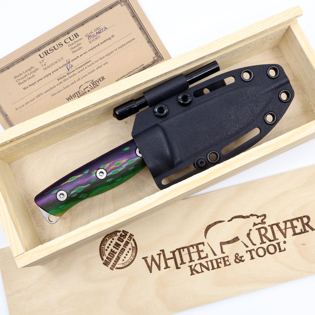 The White River Knife & Tool Ursus Cub delivers an ideal balance of compact size and full-strength outdoor performance—now elevated with striking custom Jokerfish G-Carta scales for a unique and highly functional upgrade.