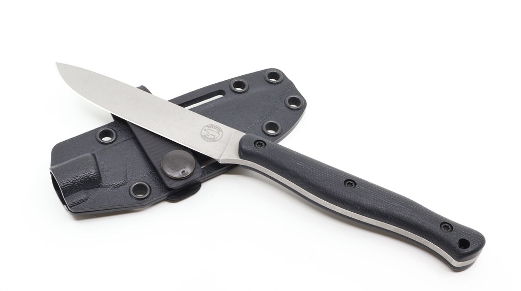 Crafted from premium CPM S35VN steel (Rc. 58–60), the Exodus 4 offers excellent edge retention and toughness in a lightweight 3.5 oz frame. Its black canvas micarta handle ensures a secure grip in all conditions, while the leather-honed edge arrives razor-sharp and ready for work.